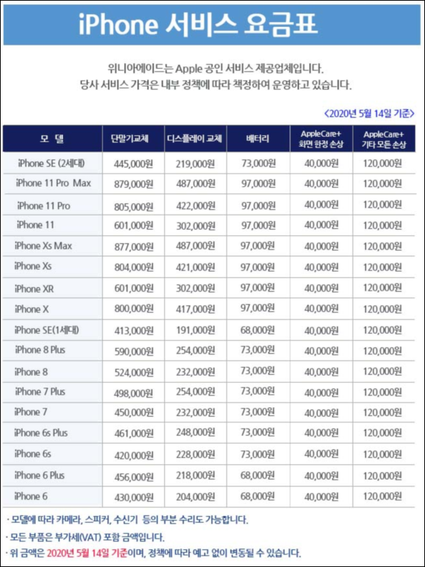 아이폰 수리 비용 가격표 입니다.